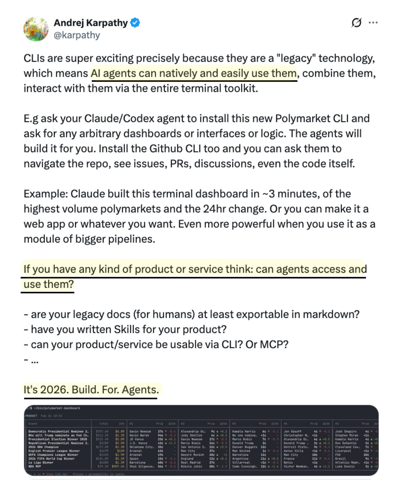 Andrej Karpathy put it bluntly last week: “It’s 2026. Build. For. Agents.”