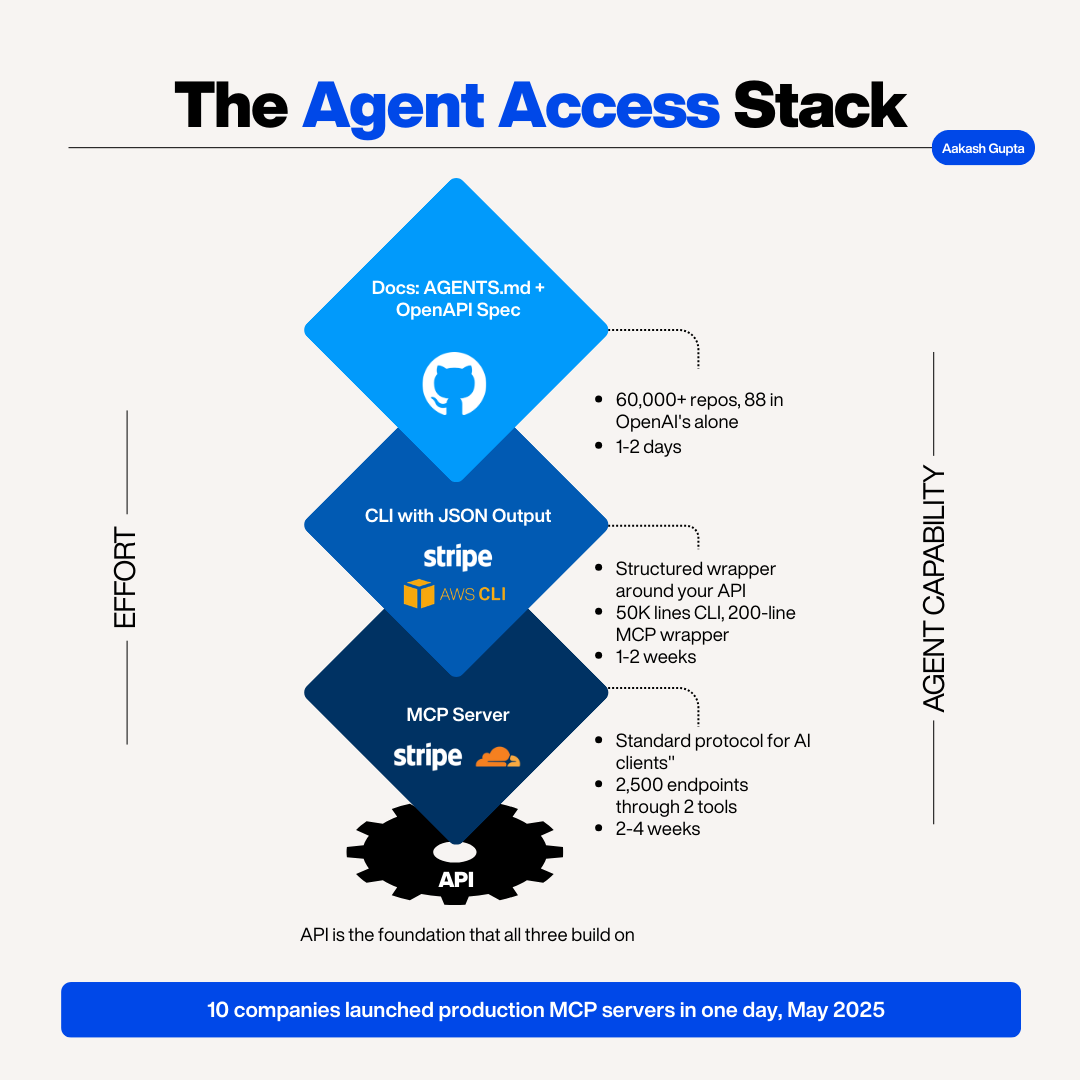 Your API is always the foundation. MCP servers call it under the hood. CLIs call it under the hood. If your API is a mess, everything above it will be too. If your auth is broken, neither MCP nor a CLI will fix it.