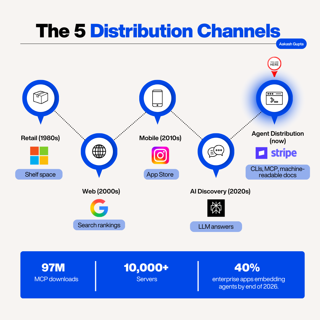 This is the one Karpathy is talking about. Agents don’t discover products through search results or app stores. They discover them through CLIs, MCP servers, and machine-readable documentation. They don’t onboard. They don’t browse. They connect, authenticate, execute, and move on.