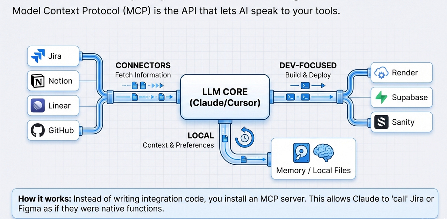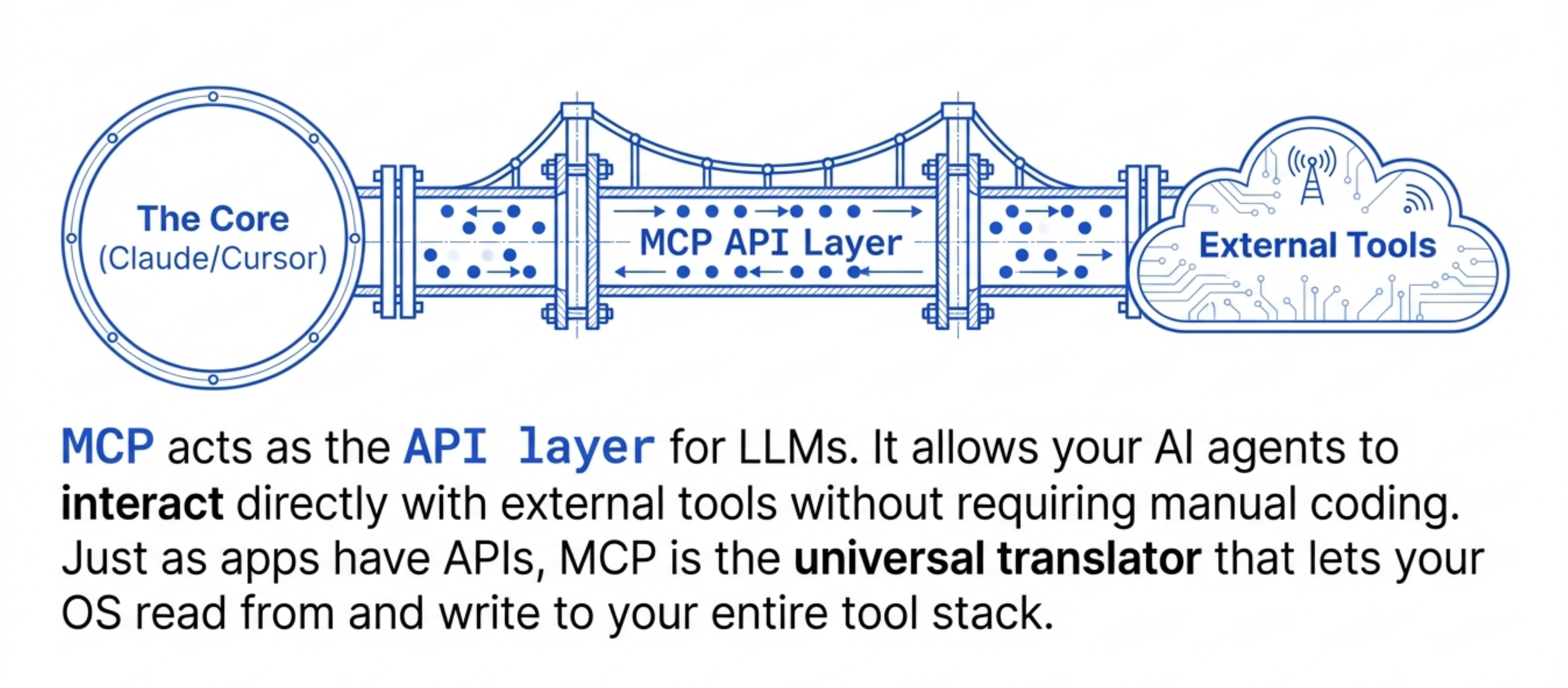 MCP is the protocol that lets Claude and Cursor talk to all those APIs without you needing to code integrations manually.