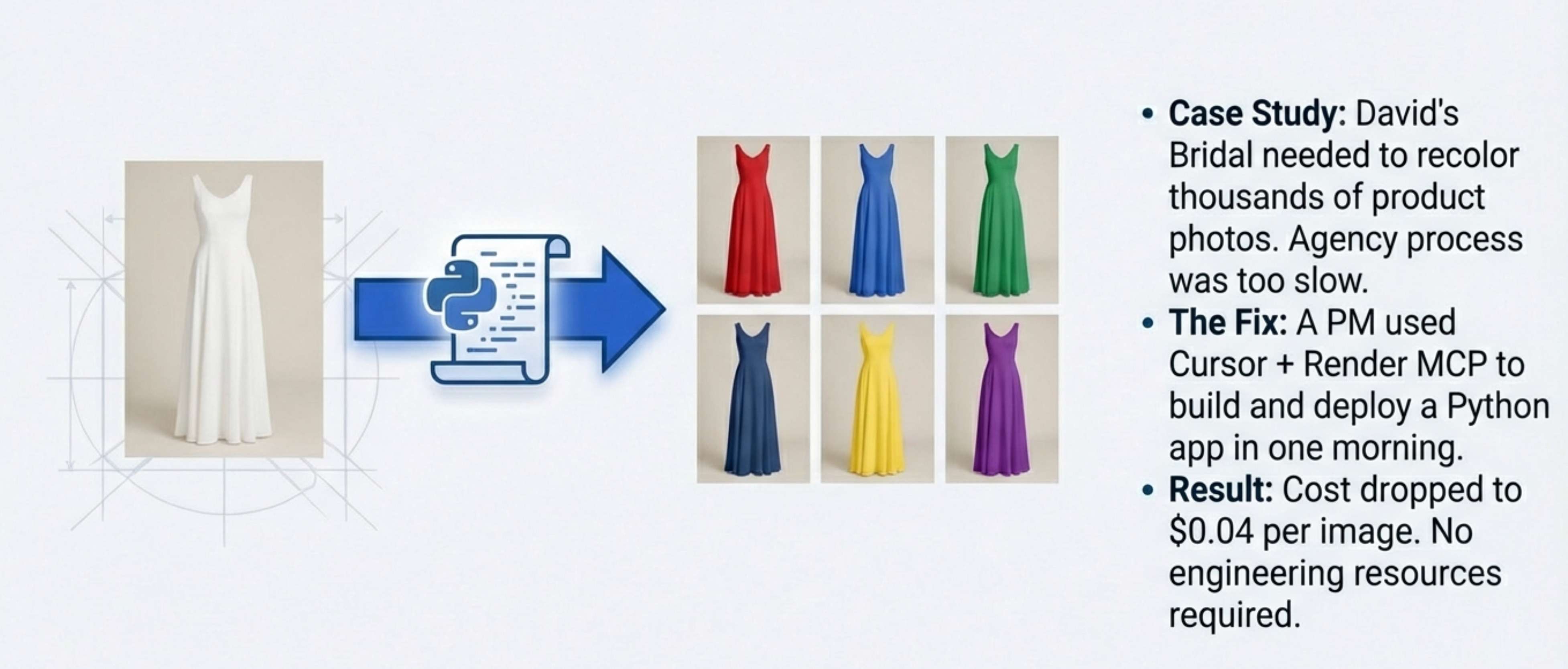 “I need to build a colorization app. We shoot dresses in one color and need to generate 60 color variants. Use [specific image API]. Set up deployment on Render.”Cursor builds the app. Uses Render’s MCP to handle deployment.