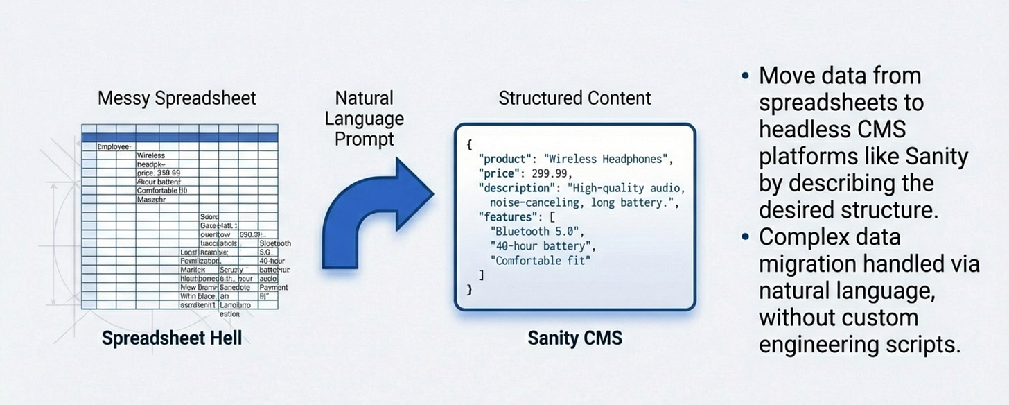 “Migrate this spreadsheet data into Sanity CMS. Set up the content structure with these fields. Handle the data transformation.”Cursor does the migration through the MCP.