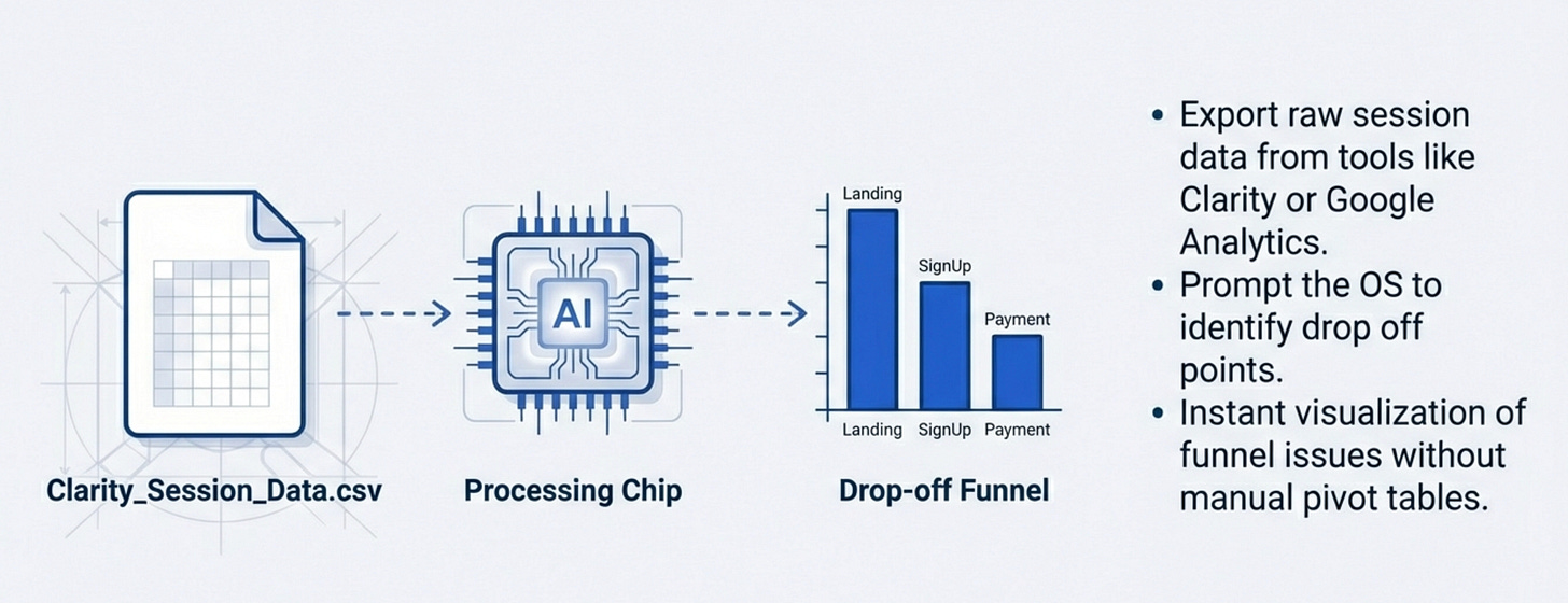 “Analyze this user session data. What are the most common drop-off points? Which features have highest engagement? Are there patterns in failed conversions?”Claude analyzes the entire dataset and generates insights.