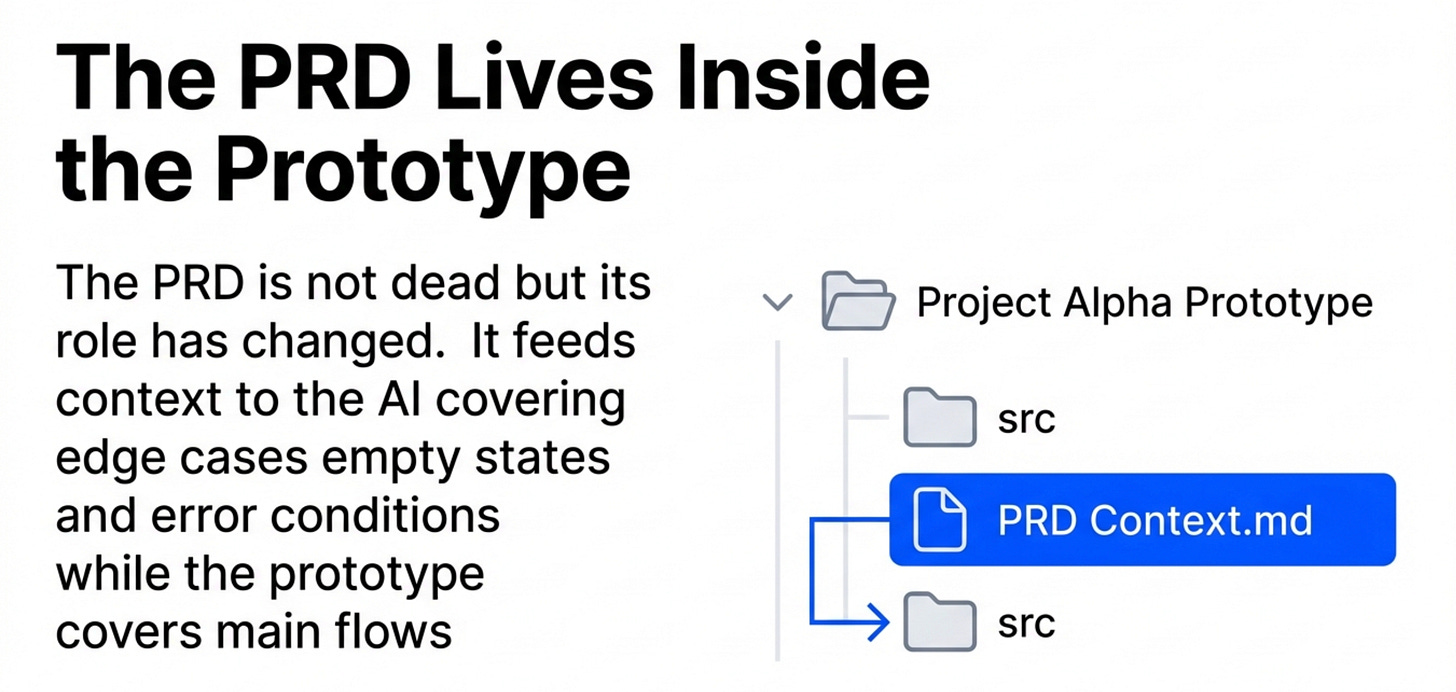 The PRD should live inside the prototype project as a file in the same folder. When you do that, the AI reads it when you prompt new features. It doesn’t skim. It applies the context. Your PRD stops being documentation and starts being active instruction.