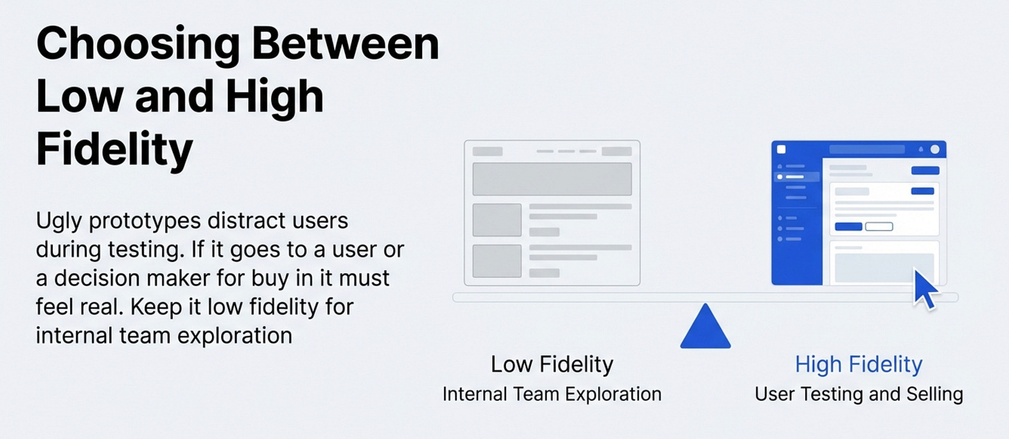 The right workflow is low fidelity for internal team exploration, then one high-fidelity version for users. Not every prototype needs to reach high fidelity. But any prototype going to users does.