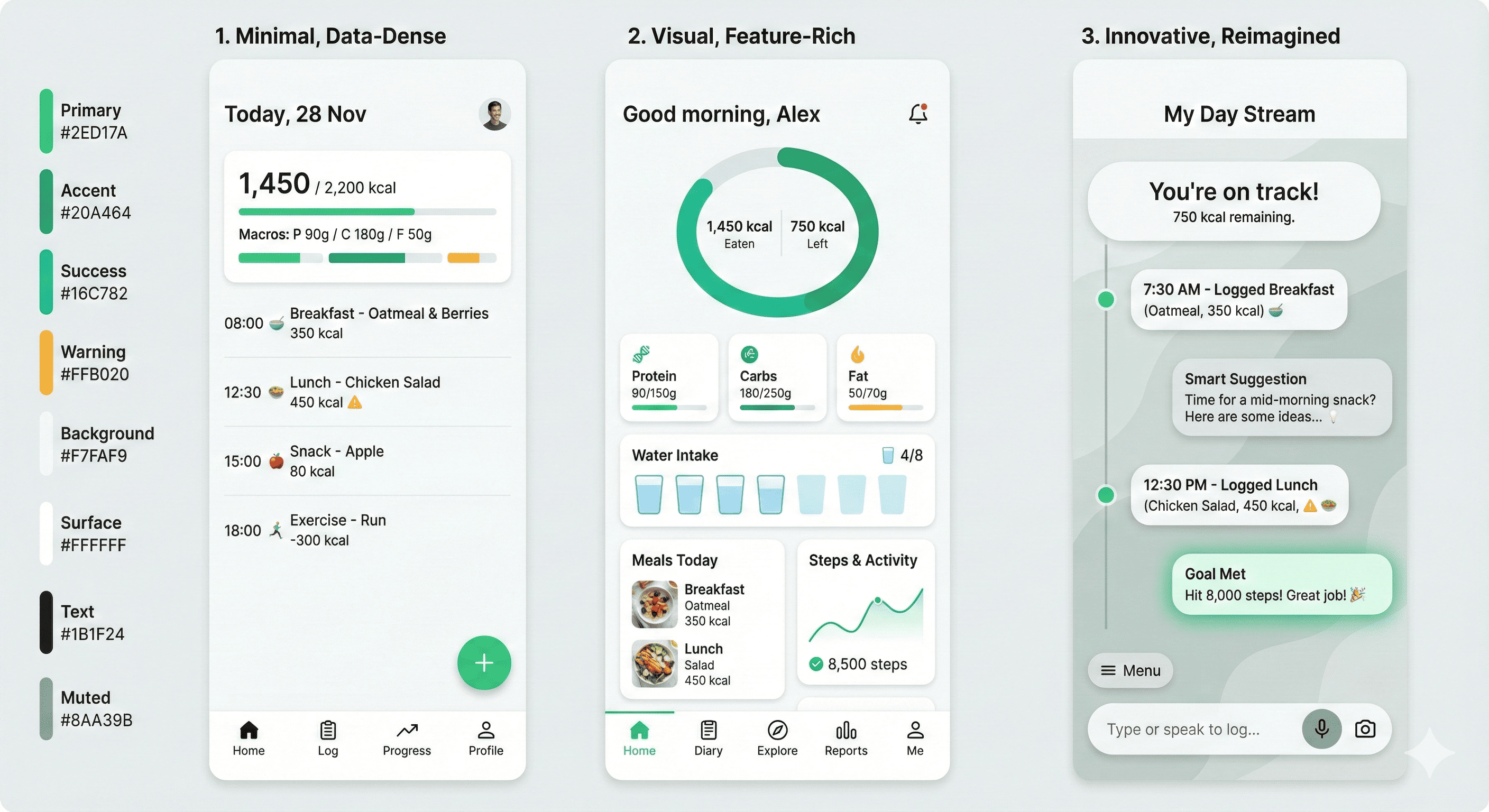 Create a set of 3 UI mockups for {FEATURE/SCREEN} showing different design approaches. For the first, use a minimal, data-dense design prioritizing efficiency. For the second, create a more visual, feature-rich interface. For the third, design an innovative approach that reimagines how this interaction could work. Use a consistent color palette based on {BRAND COLORS}, and include realistic placeholder data. Make each mockup distinct but implementation-feasible.4/ Visualize data patterns and anomalies