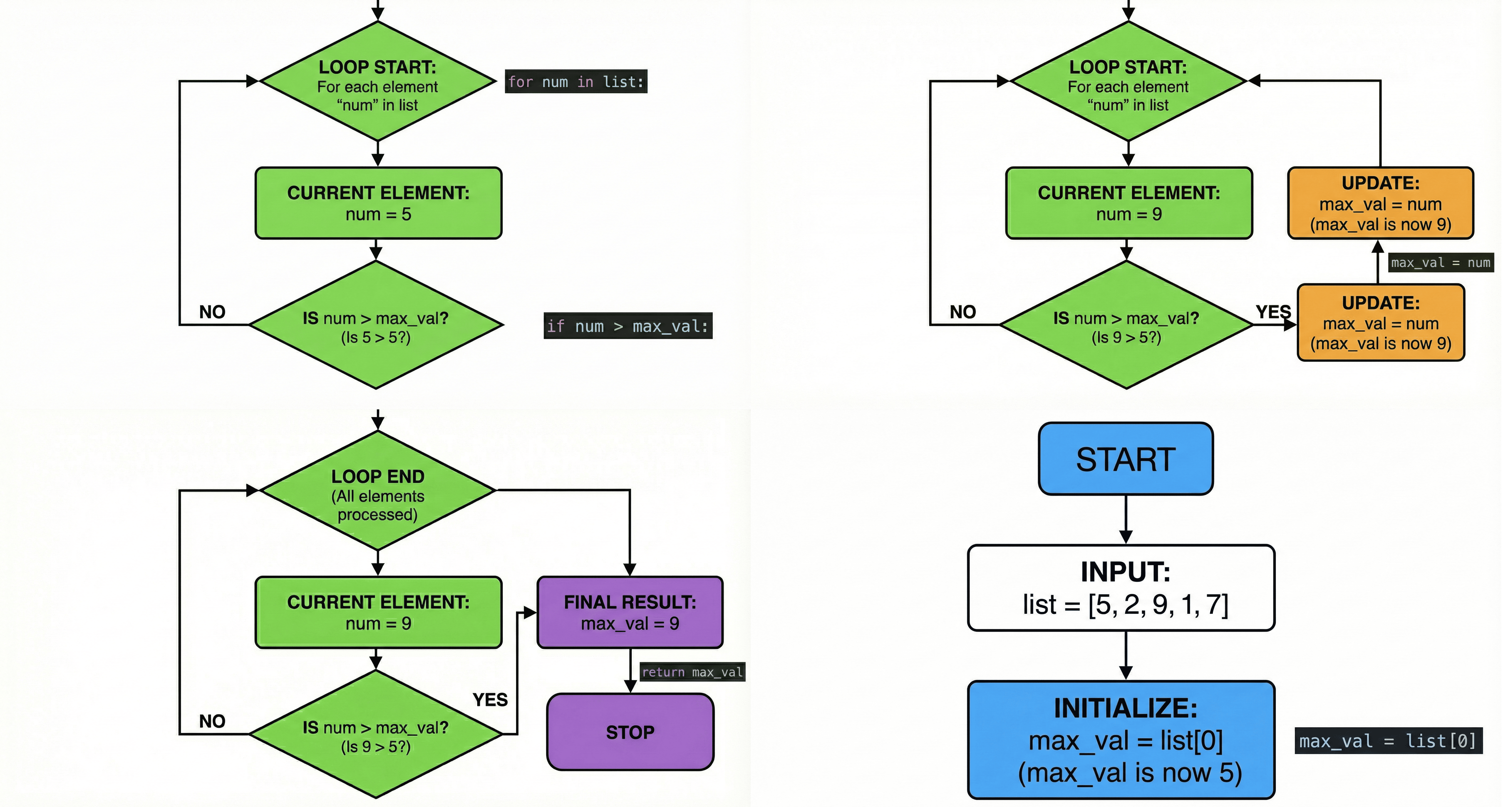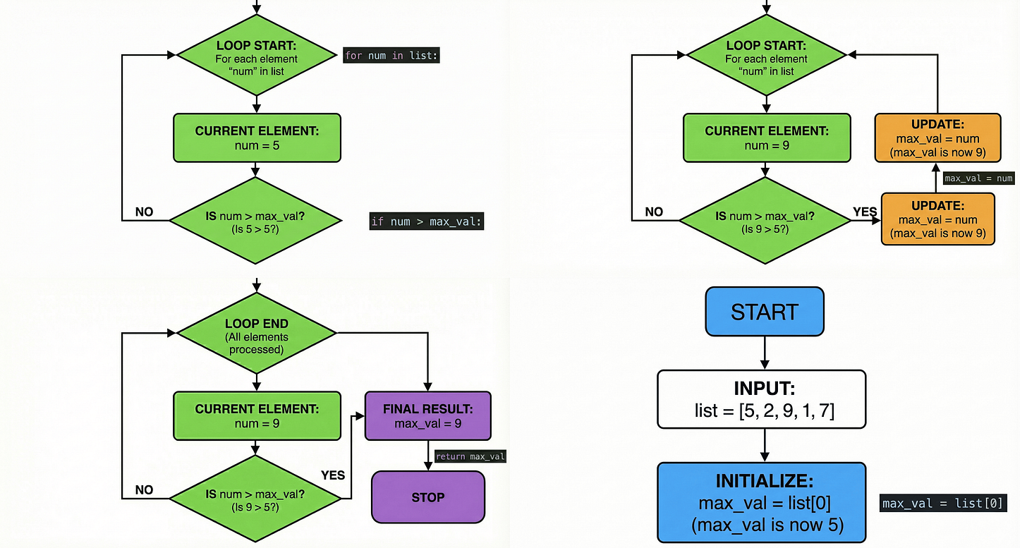 Create a visual explanation of how this [ALGORITHM/CODE BLOCK] works. Use a step-by-step flowchart with clear annotations explaining each operation. Include small code snippets where relevant, but focus on making the logic visually intuitive. Use color coding to distinguish between [DIFFERENT OPERATIONS/PHASES]. Make the visualization detailed enough for engineers but clear enough for non-technical stakeholders.That’s all for today. See you next week,