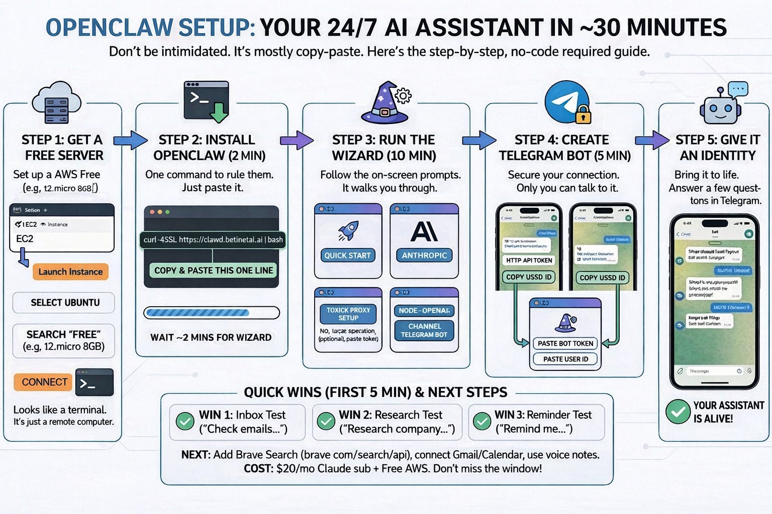The wizard walks you through everything. Pick your model provider. Choose your messaging channel (WhatsApp, Telegram, Discord, etc.). Scan a QR code or authenticate Telegram token and you are done.