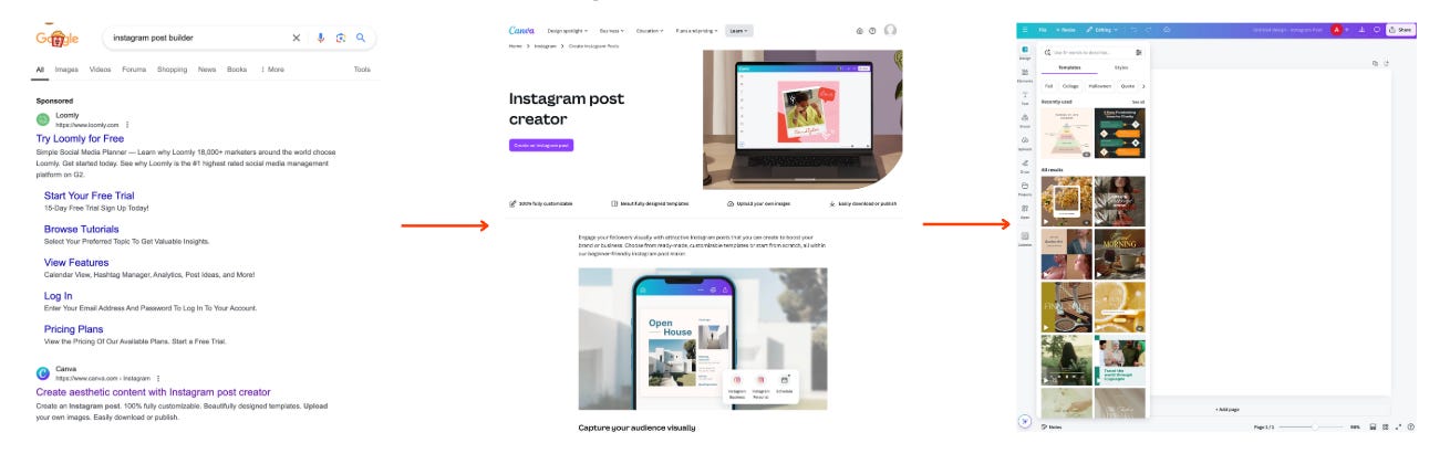 What do they see? One click to free tool to build Instagram post. No login. No credit card. Acquiring millions monthly who’ve never heard of Canva.