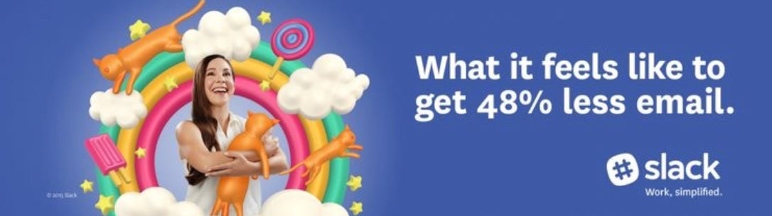 Marketing: Banner ads, buses, billboards, TV commercials. “Slack helps you get less email.” Positioning against the incumbent (email). Traditional brand advertising.