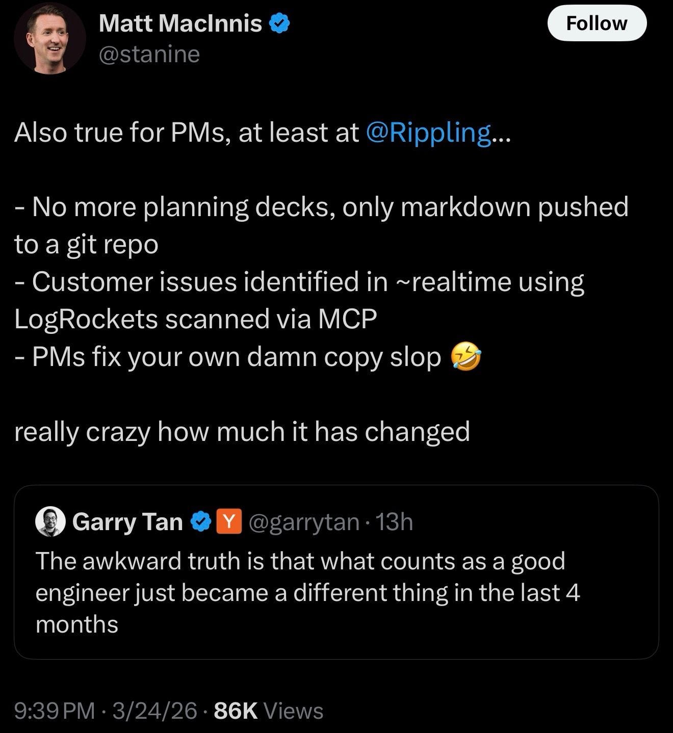 Matt MacInnis is the CPO at Rippling, a $16B+ workforce platform. He posted this last week: