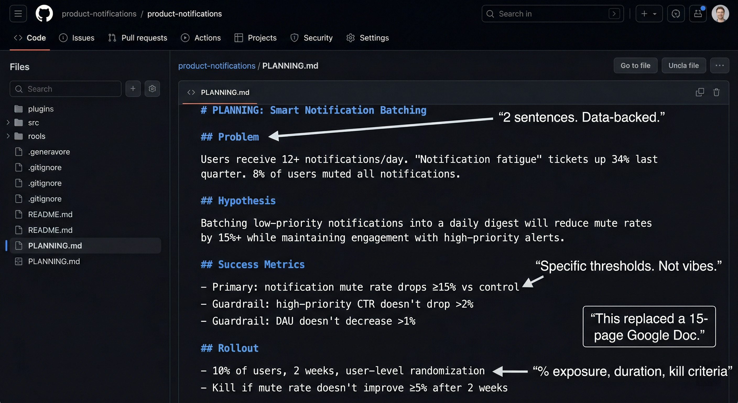 The README addresses product directors: “You’re deploying a planning system for your team. Here’s how to set it up, measure it, and iterate.” When they join a new company, they fork this in week one.