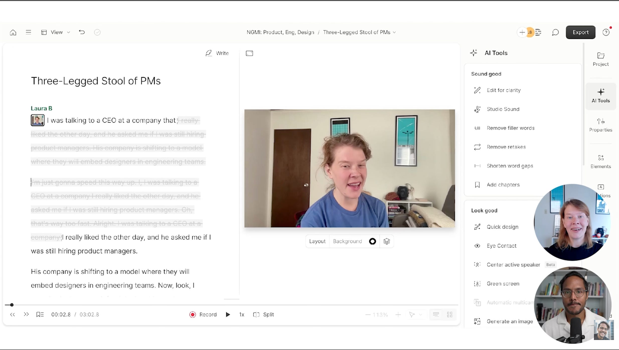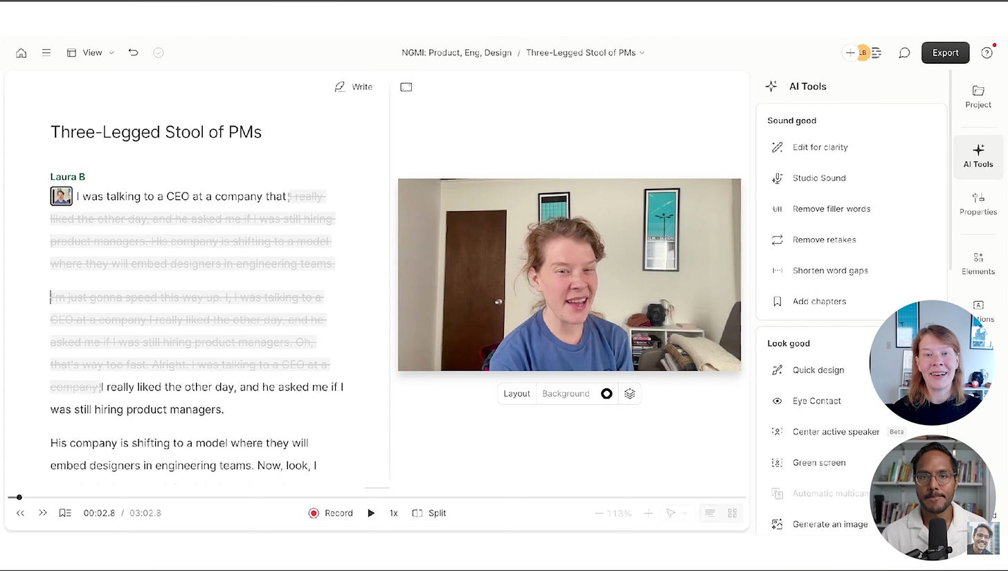Descript then put these features into prepackaged buttons: Edit for Clarity, Remove Filler Words, Remove Retakes, Add Chapters.