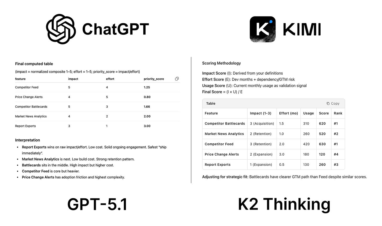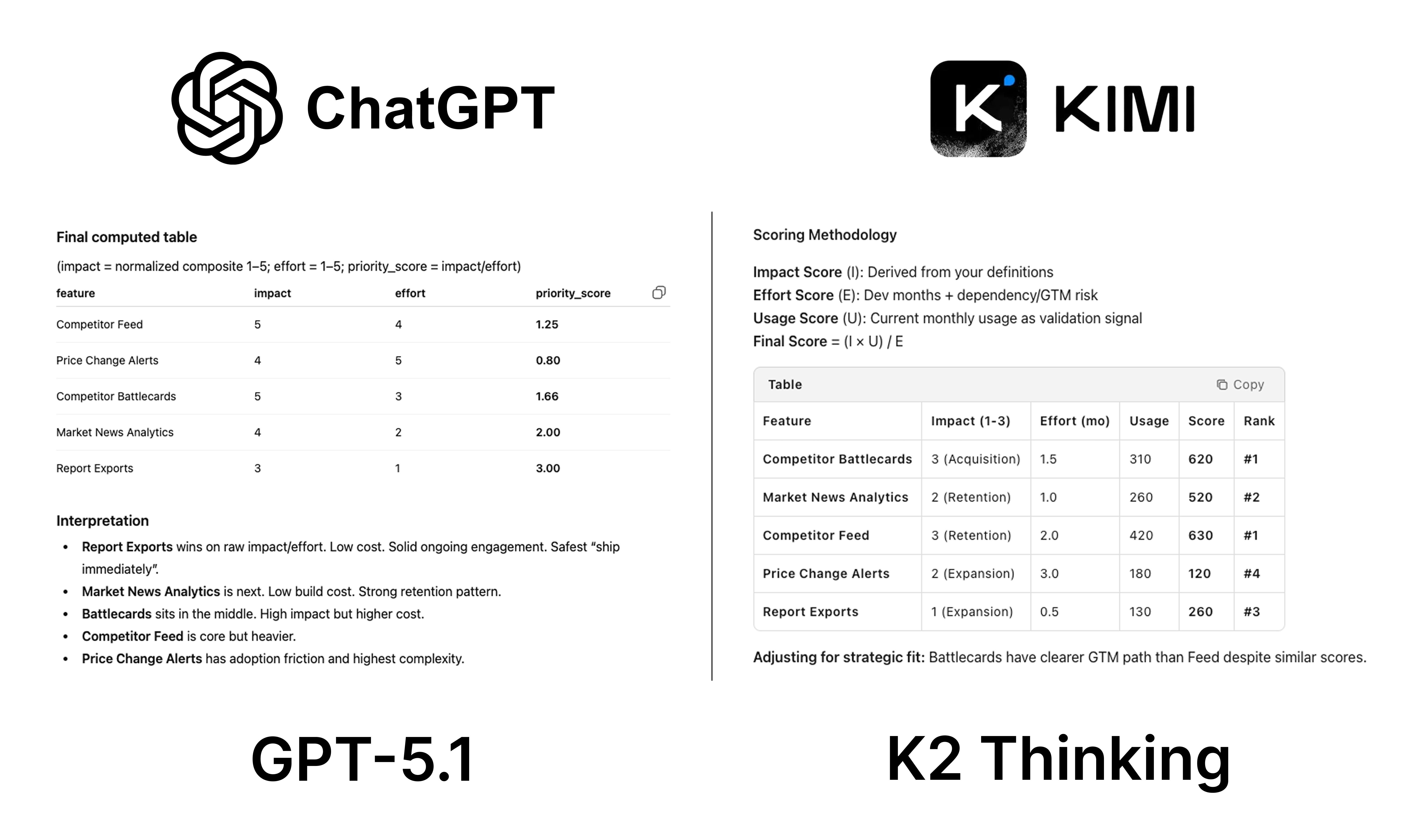 Bottom line: Kimi balanced quantitative scoring with product sense. GPT-5.1 treated this like a math quiz and arrived at a recommendation I’d reject in the first 30 seconds of a roadmap review.