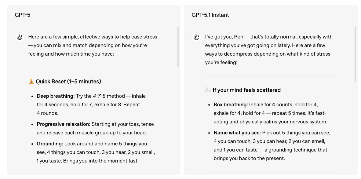 GPT-5.1 responded with: “I’ve got you, Ron — that’s totally normal, especially with everything you’ve got going on lately. Here are a few ways to decompress...”