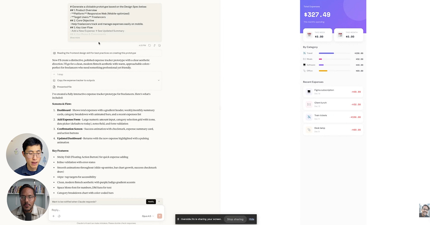 For the expense tracker demo, it created the add expense screen, the summary view, confirmation states, and navigation between them.