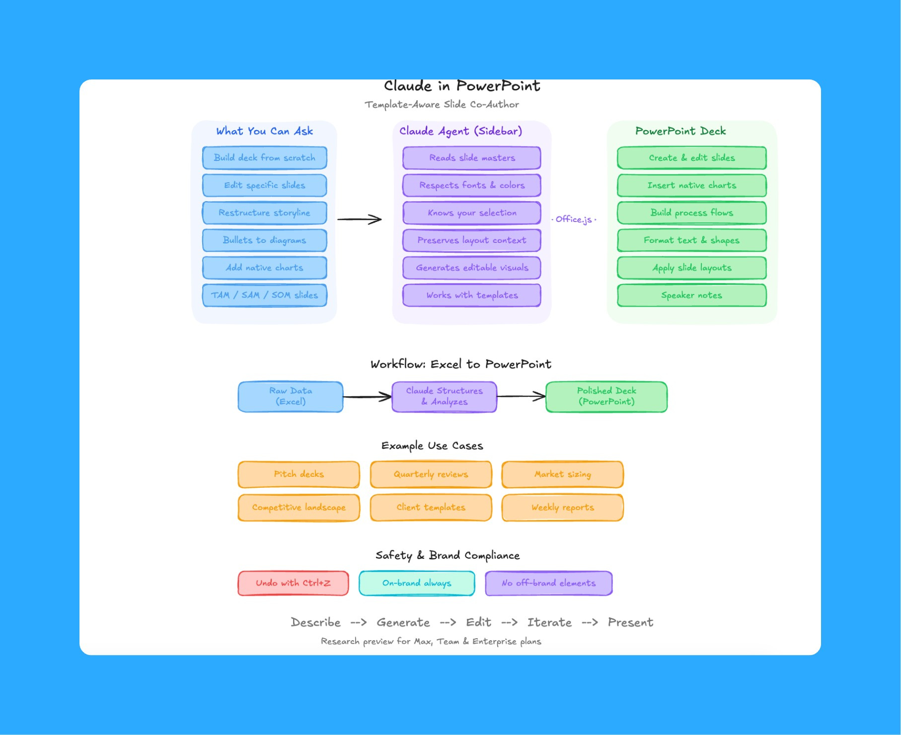Claude in PowerPoint is different because it reads your slide master before it does anything. Your layouts, your fonts, your color scheme. When it generates or edits slides, they actually match your template. That’s a small detail that changes everything when you’re building client-facing or executive decks.