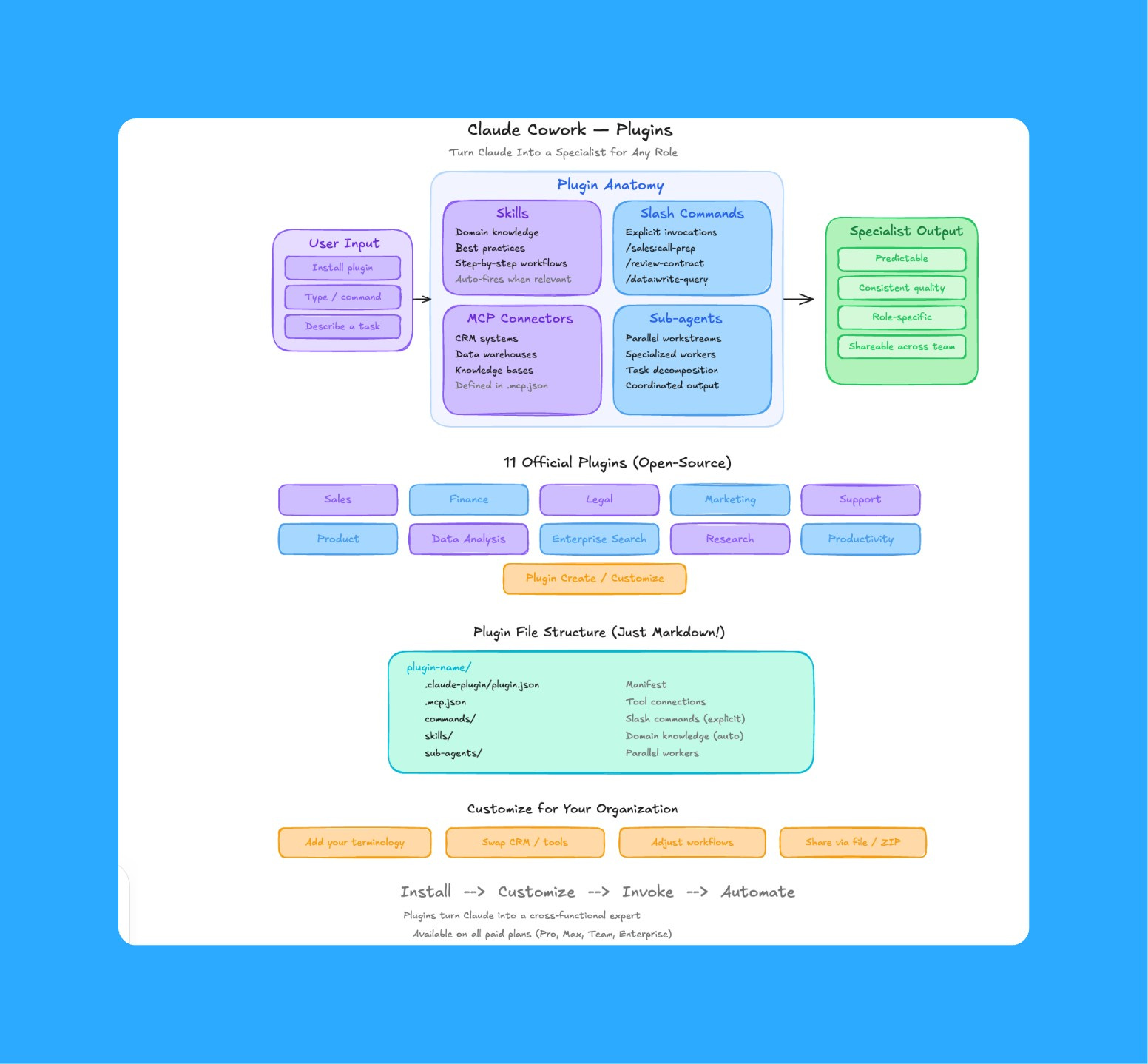 Each plugin is a complete package. Skills (the domain knowledge Claude draws on), slash commands (specific actions you trigger with /), MCP connectors (integrations with external tools), and sub-agents (specialized workers that run in parallel). All bundled together and configured for a specific business function.