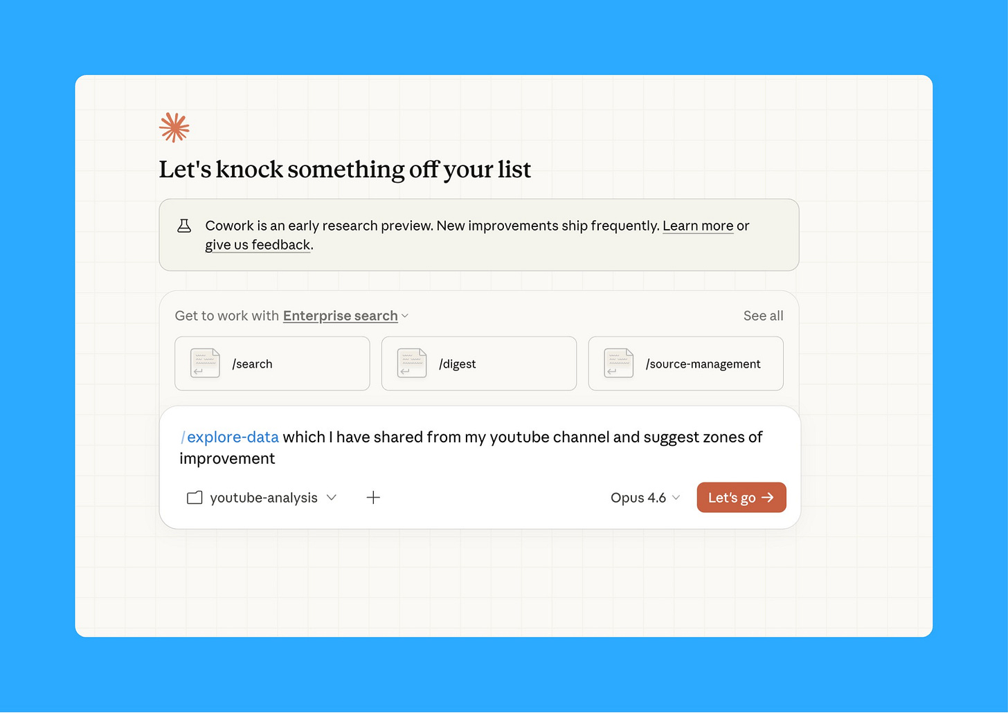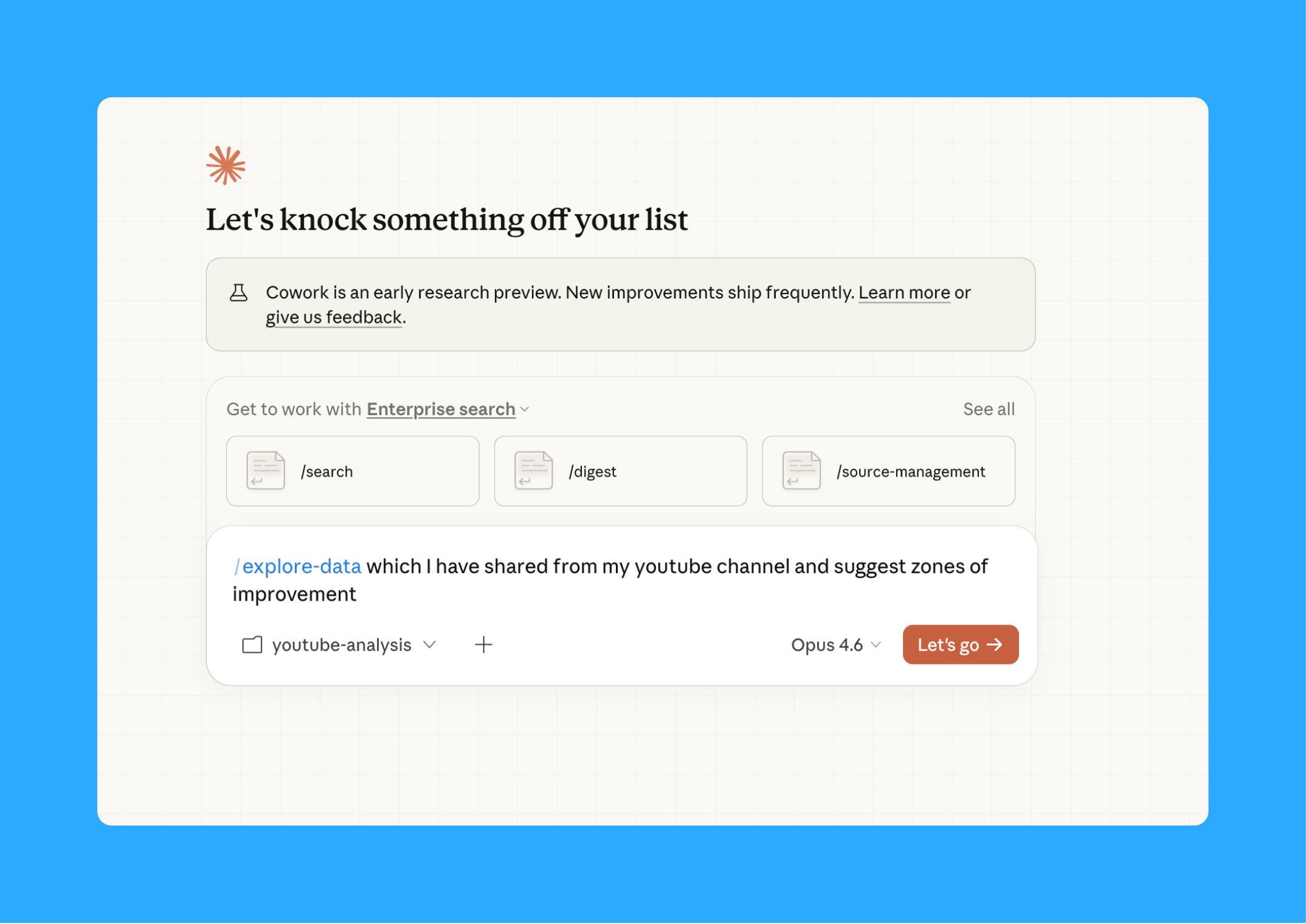 Here’s how I actually use it in practice. I have compiled all my youtube data in a folder and asked cowork to find gaps in it to improve my channel. I used the /explore-data command and claude found where my retention was dropping hard, what kind of thumbnail drove higher CTR and many more. Specific patterns I would have spent an afternoon finding in Claude found them in 90 seconds.