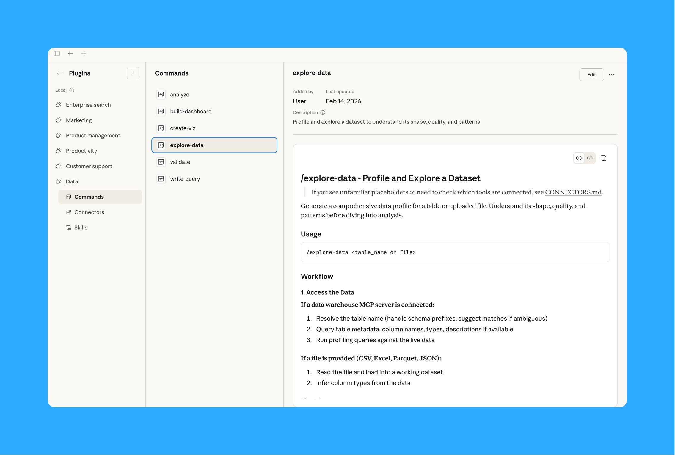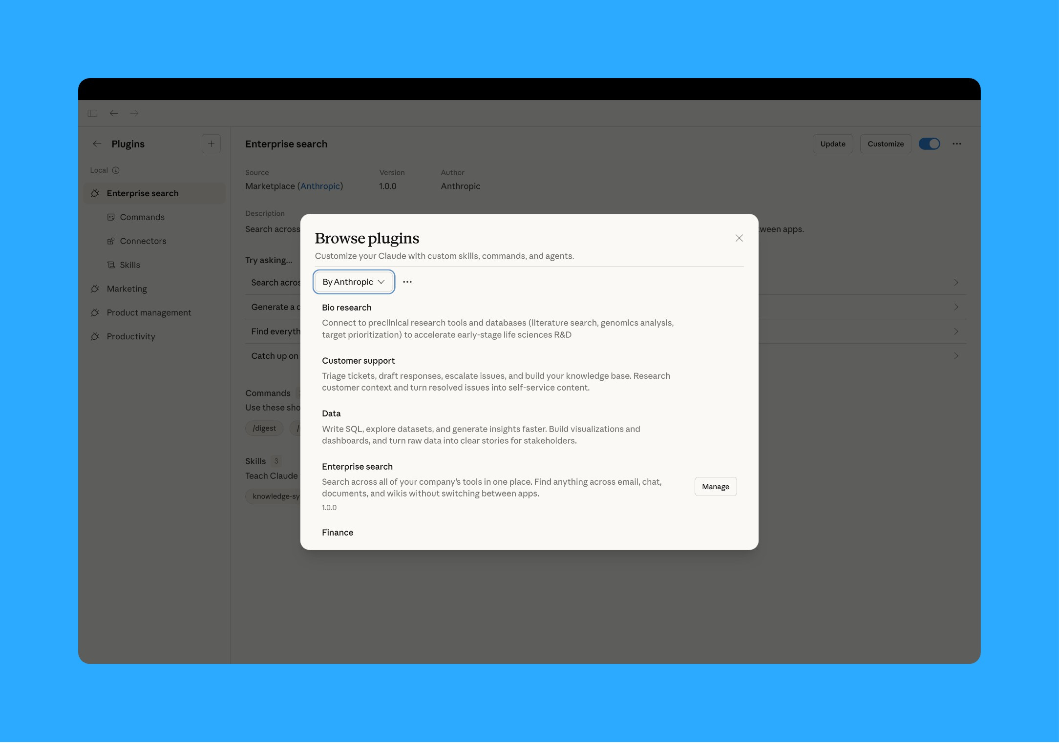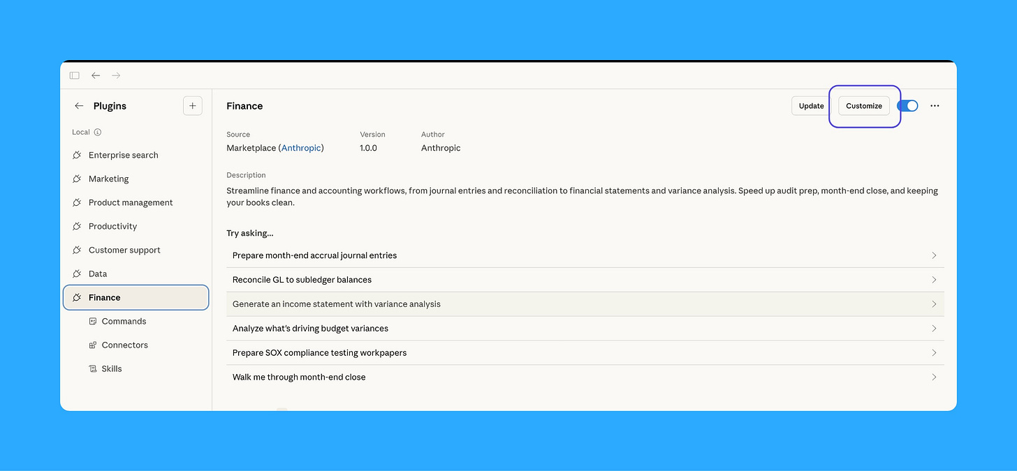 The real unlock is that every plugin is completely customizable. Don’t like how the Finance plugin structures a DCF model? Click “Customize” and tell Claude to adjust the methodology. Want to add your company’s specific feature categories or market segments to the Product plugin? Just describe what you need and Claude rewrites the plugin for you.