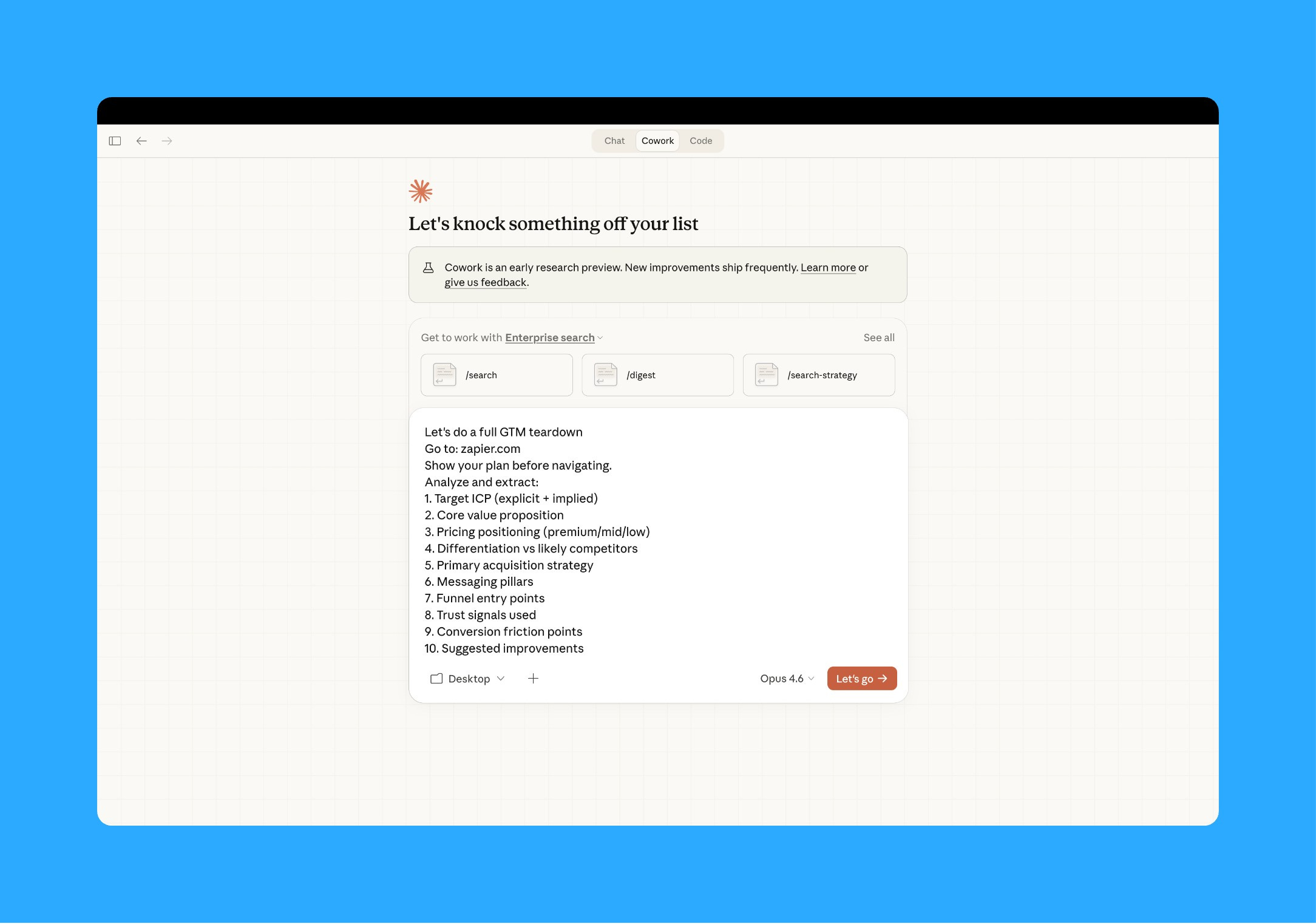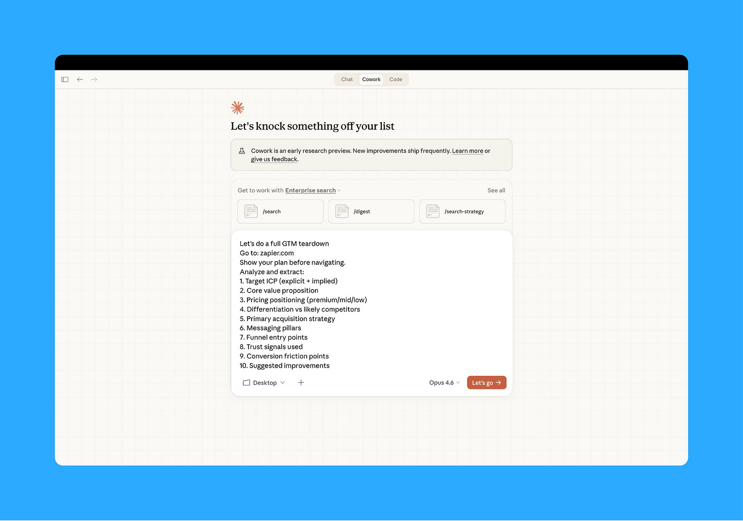 I ran a full competitive analysis for a product planning session last week. Chrome visited five company websites and their G2 review pages. Cowork took all of that data and produced a 12-slide deck with positioning maps, feature comparisons, and pricing tables. I made a few tweaks and presented it the next morning. That entire workflow used to take me a full day.